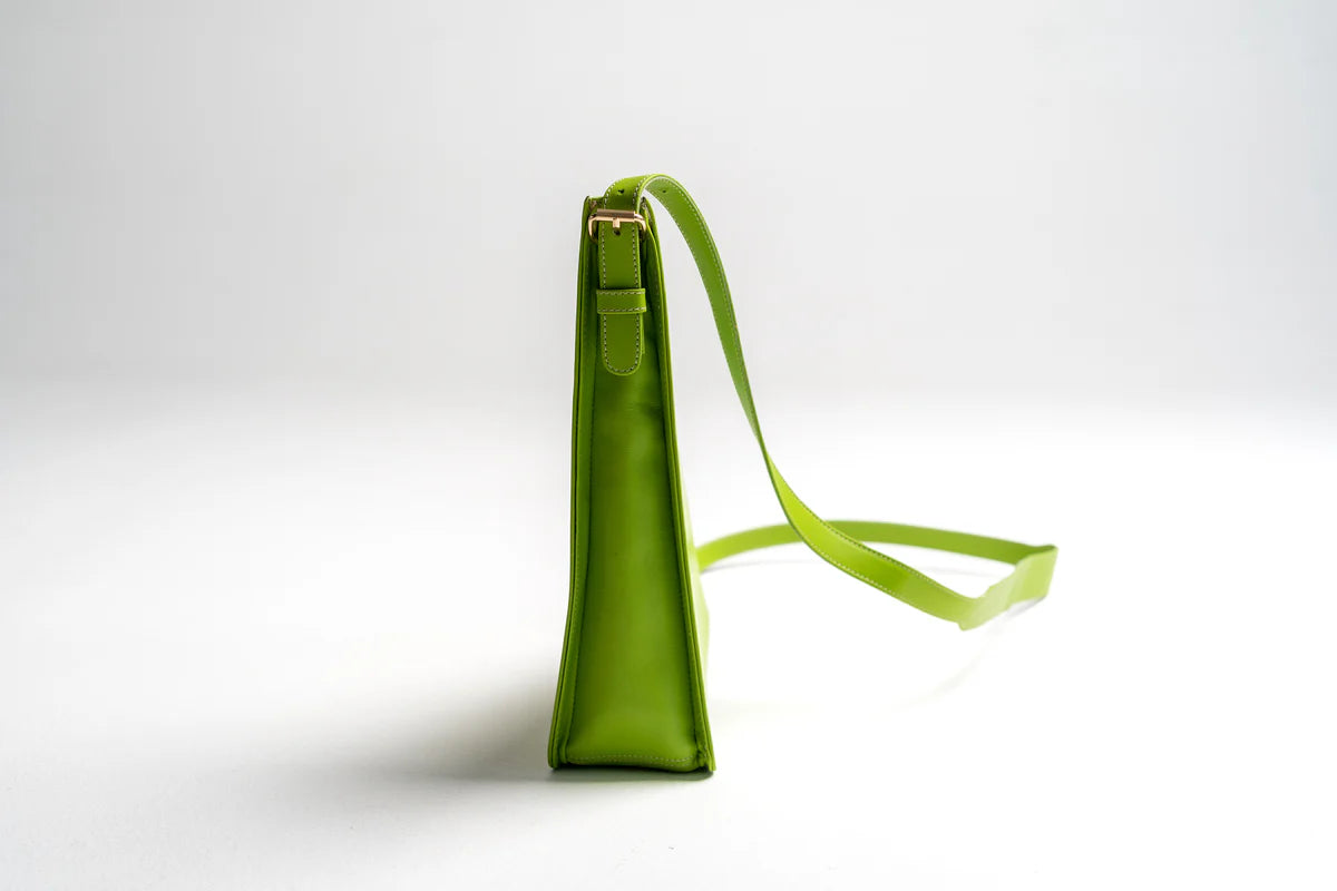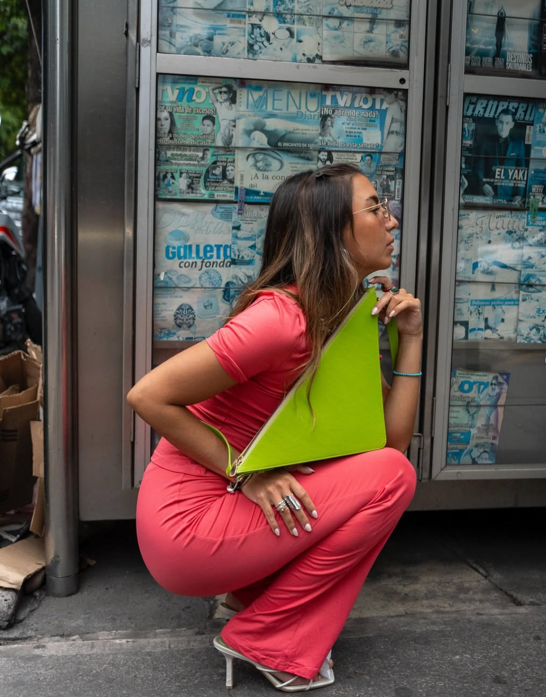 Bolsa triangular de piel con estructura firme y asa larga con tamaño ajustable.