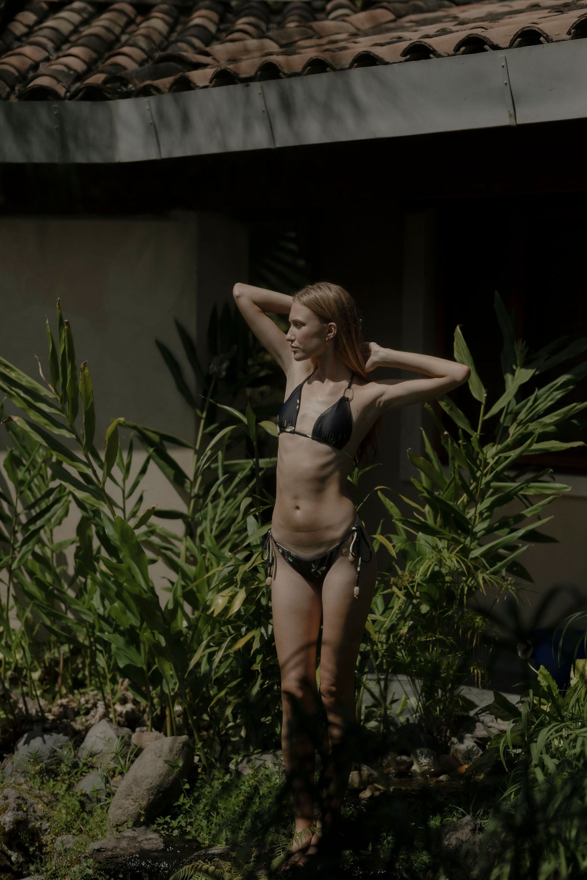 Designed in a deep ebony tone with soft ivory botanical accents, the top features adjustable triangle cups that offer customizable coverage and a naturally flattering shape. Subtle resin-inspired ring details elevate the straps with a touch of refined artistry.