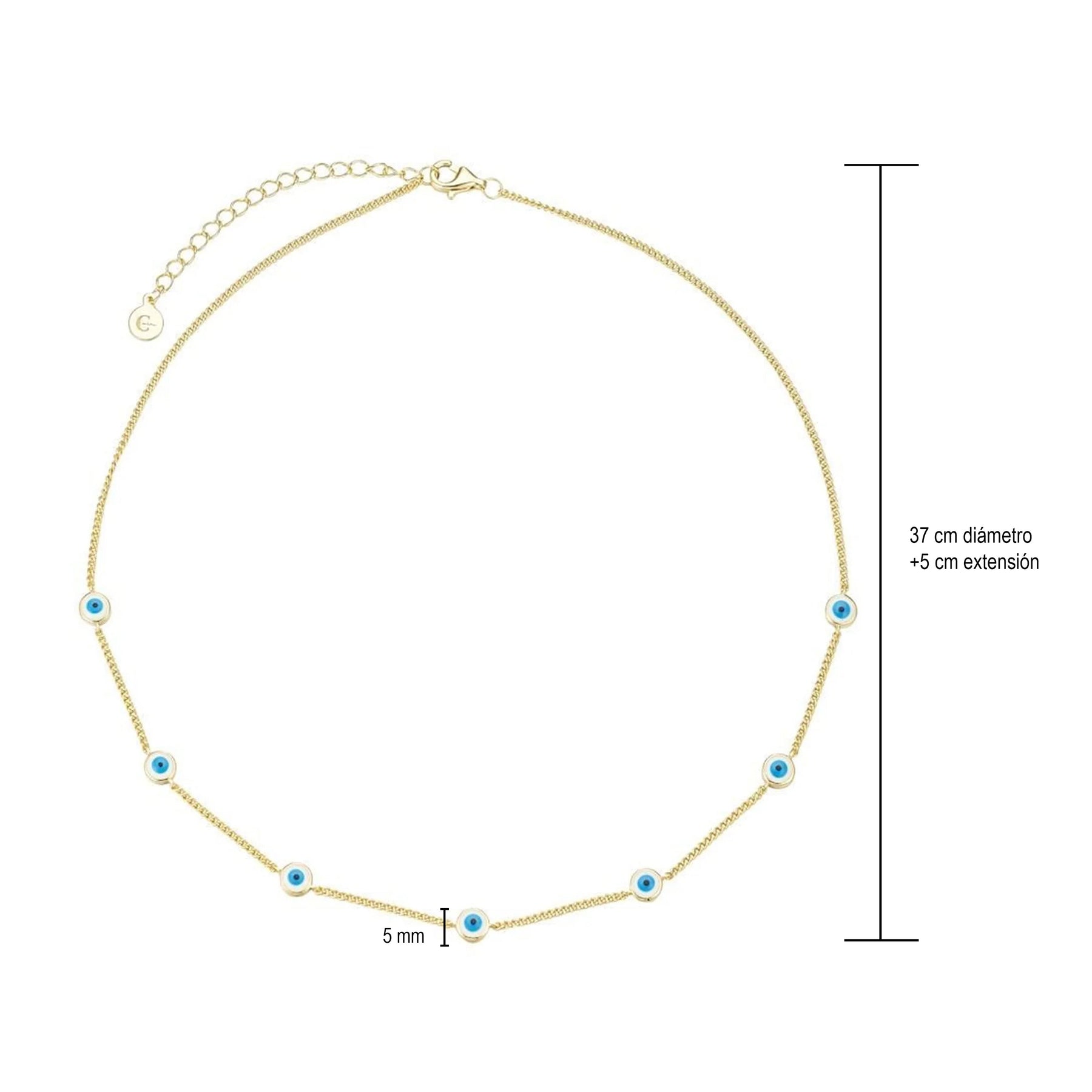 Un diseño delicado y atemporal que combina elegancia con protección. Este collar en tono dorado está adornado con pequeños dijes de ojo turco, símbolos ancestrales de resguardo y buena energía. Perfecto para llevar todos los días como un amuleto de estilo y fuerza personal.