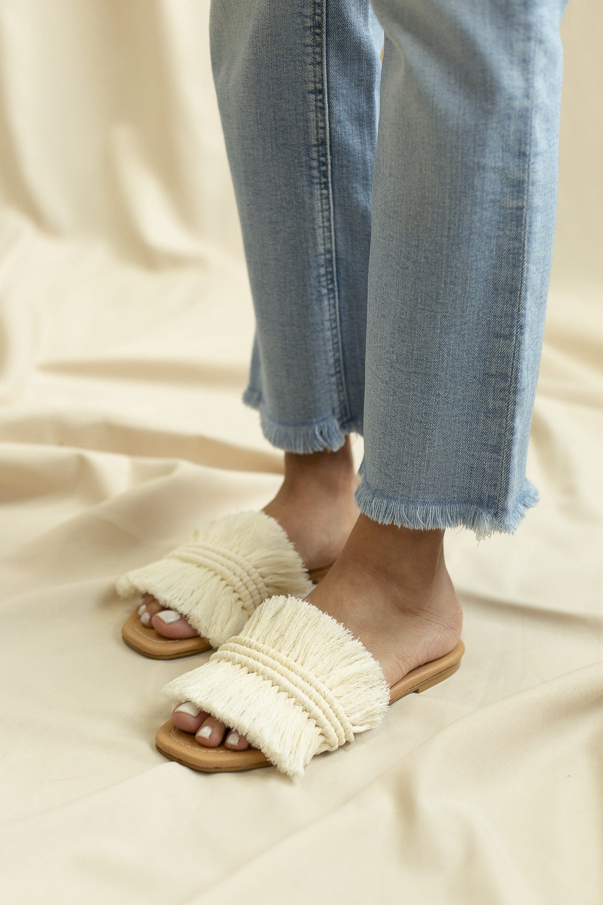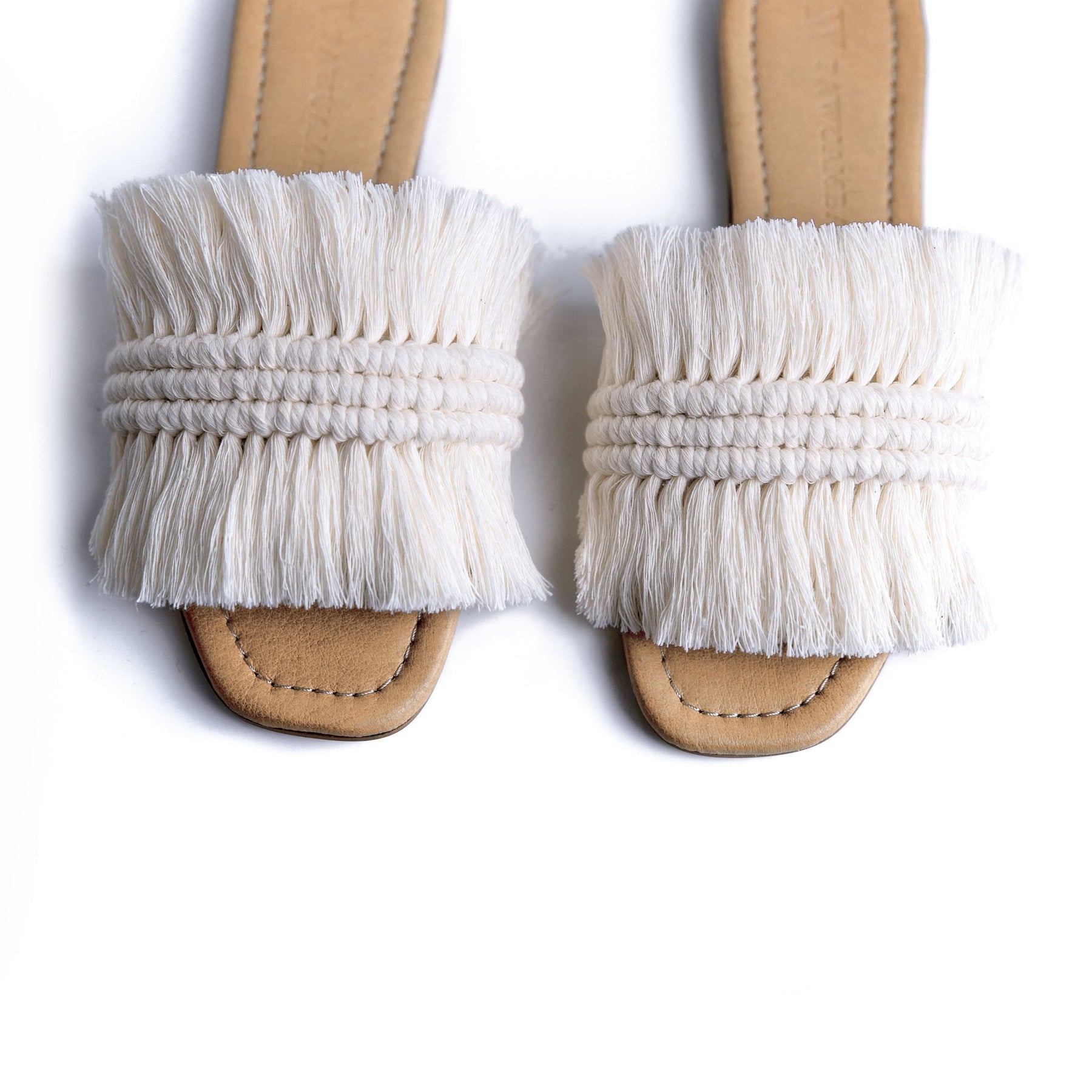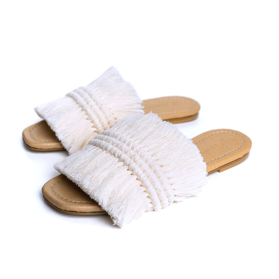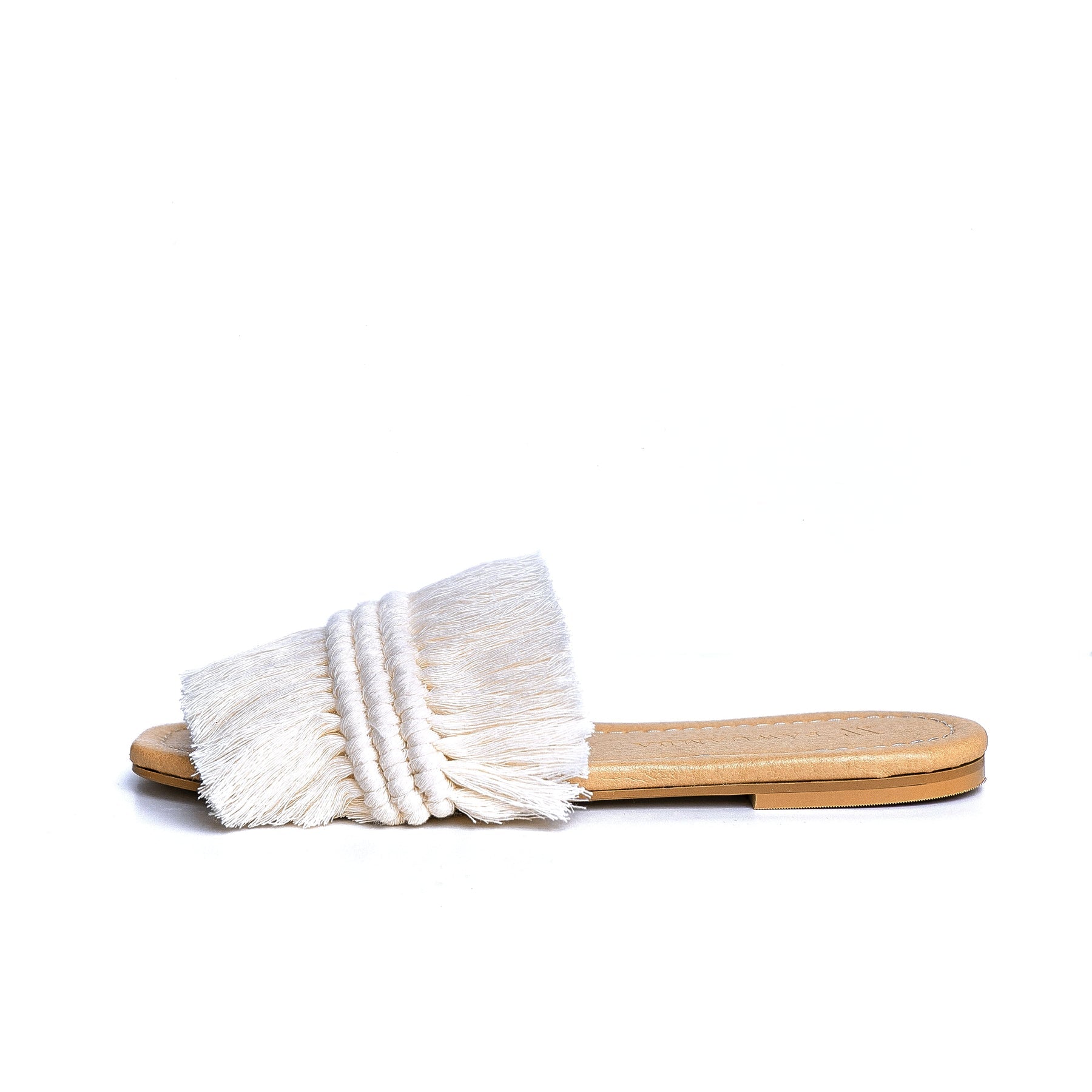 Sandalia plana creada a base de materiales regenerados con planta confort y textil tejido con hilo de algodón. Acabado en punta semi cuadrada.