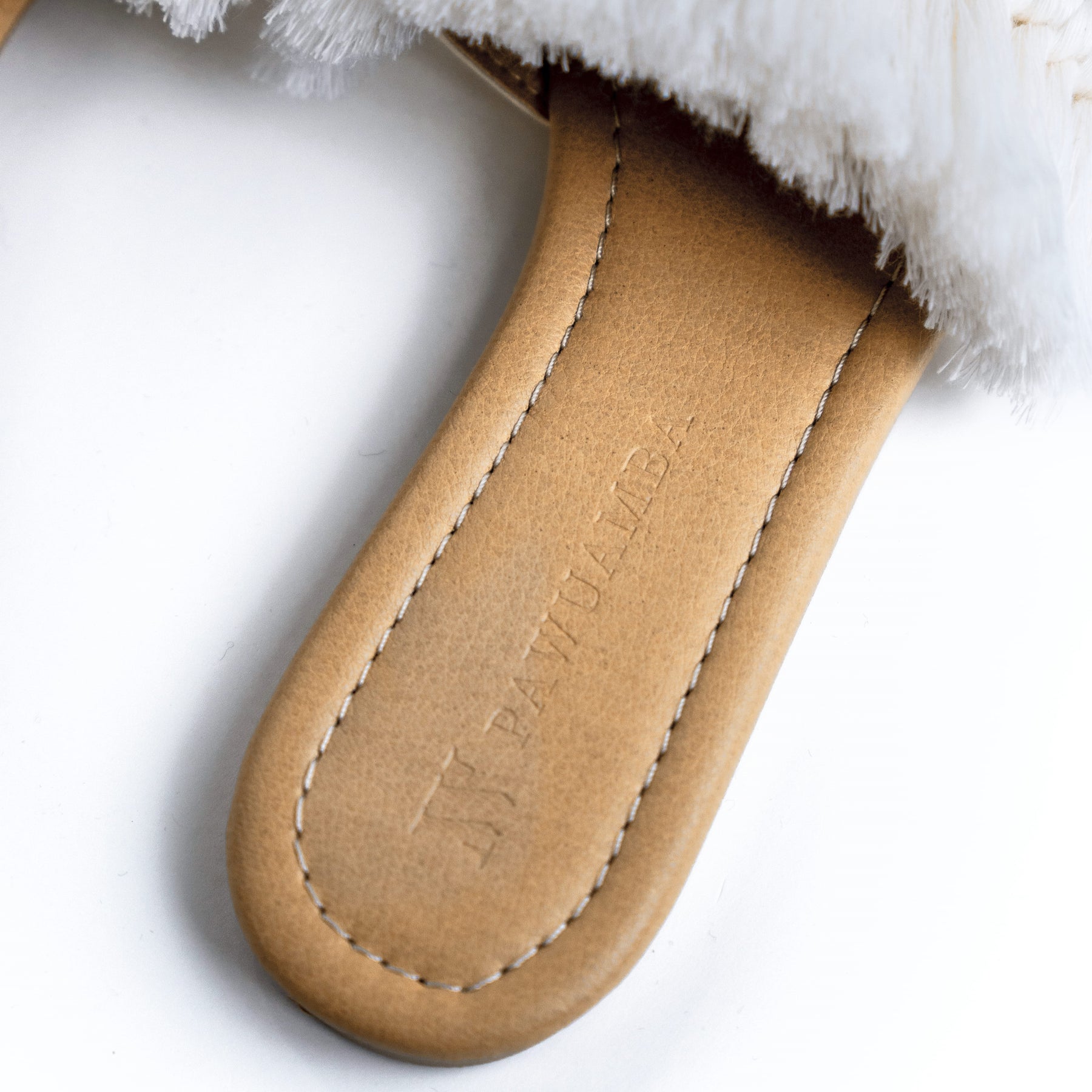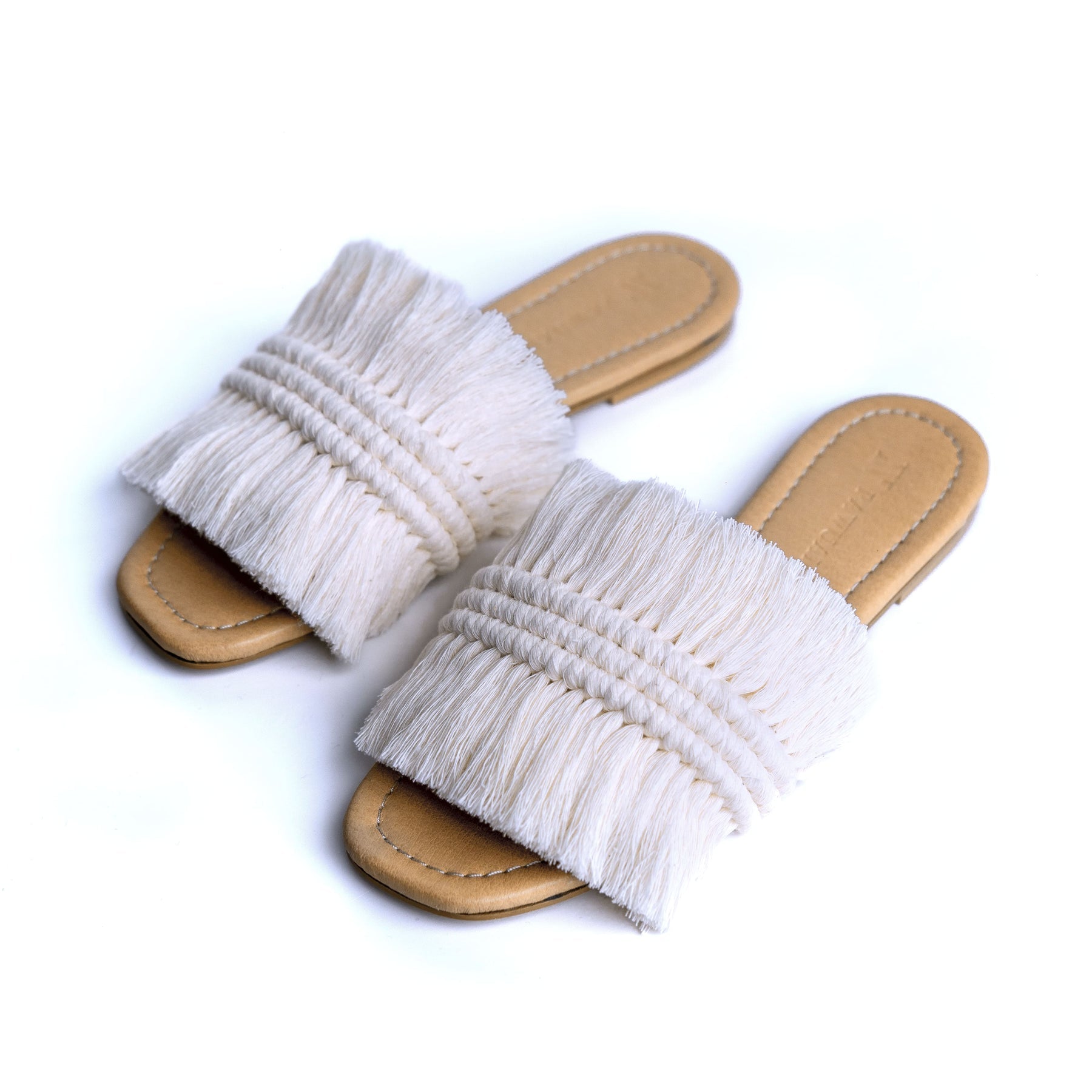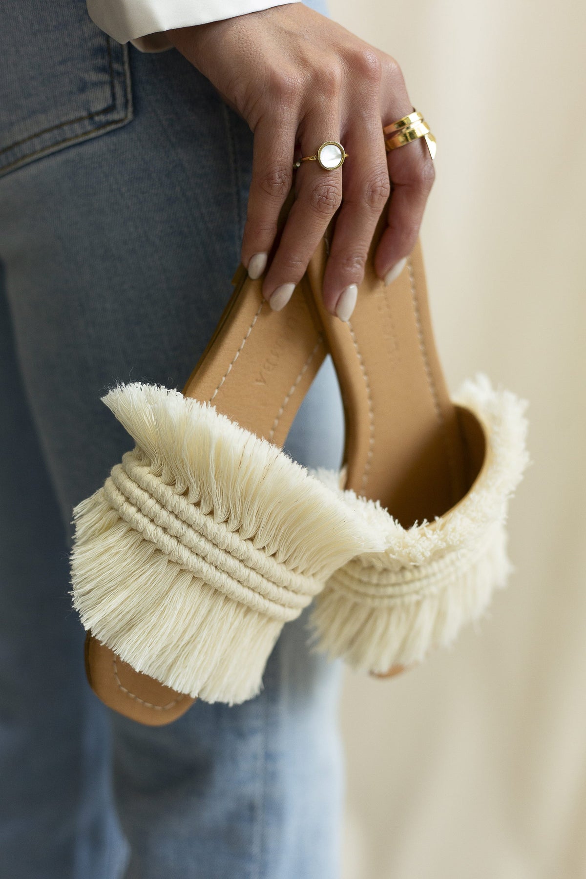 Sandalia plana creada a base de materiales regenerados con planta confort y textil tejido con hilo de algodón. Acabado en punta semi cuadrada.